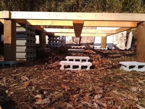 もしも少し水平が狂っているようならブロックの下にちょいと土をいれてみたり端材の薄い板を入れたりして調節しているよ