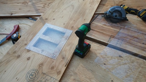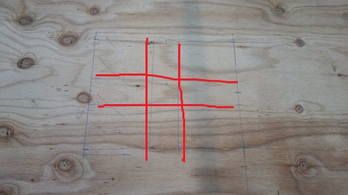 板に開ける場所の墨をだす20cm四方とは言え 乗る場所が悪いと踏み抜いて割れるおそれがあるから十字にして最悪のっても大丈夫なようにしておくか