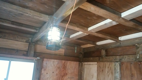 まだ電気ないから モバイルバッテリにランタンつないで仮で照明を