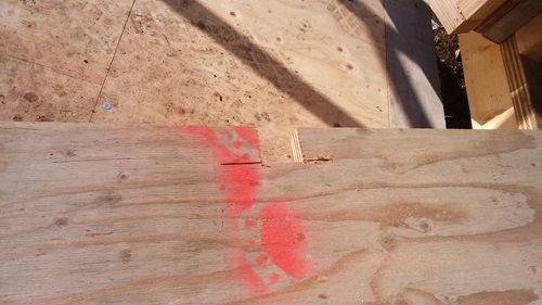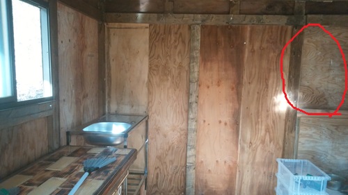 この面になるべくたくさんの物がおけるように大き目の棚をつくってゆきたが 赤丸の場所は食糧庫として外部にはみ出た小部屋につながるスライドドアがあるのでここまでは伸ばすことはできない