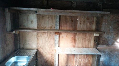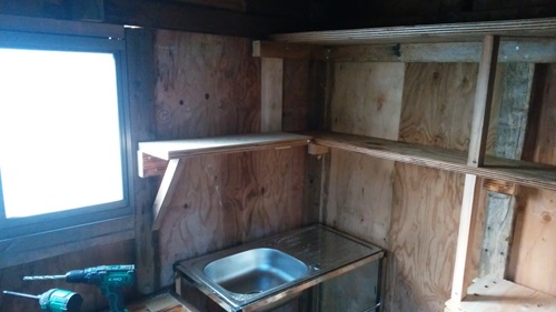 流し台があるといっても 水道を引いていないのでおのずと上に水の入ったタンクを置いて使う感じになるのでその辺も考えながら棚を作っていこう